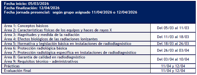 La part presencial es realitzarà el dia 11 i 12 d'abril (segons grup i depenent del nombre d'alumnes finalment inscrits l'alumne només assisteix un dels dos dies) en les instal·lacions de l'Hospital Canis Mallorca, Carrer d'Agnès de Pacs, 12, Nord, 07010 Palma, Illes Balears. L'horari del grup de matí és de 9 a 14 h i l'horari del grup de tarda és de 15 a 20 h. S'informarà del grup de pràctiques una vegada iniciat el curs. El contingut serà: pràctiques amb un equip de raigs X, seminari de repàs i resolució de dubtes i prova final del CSN.
